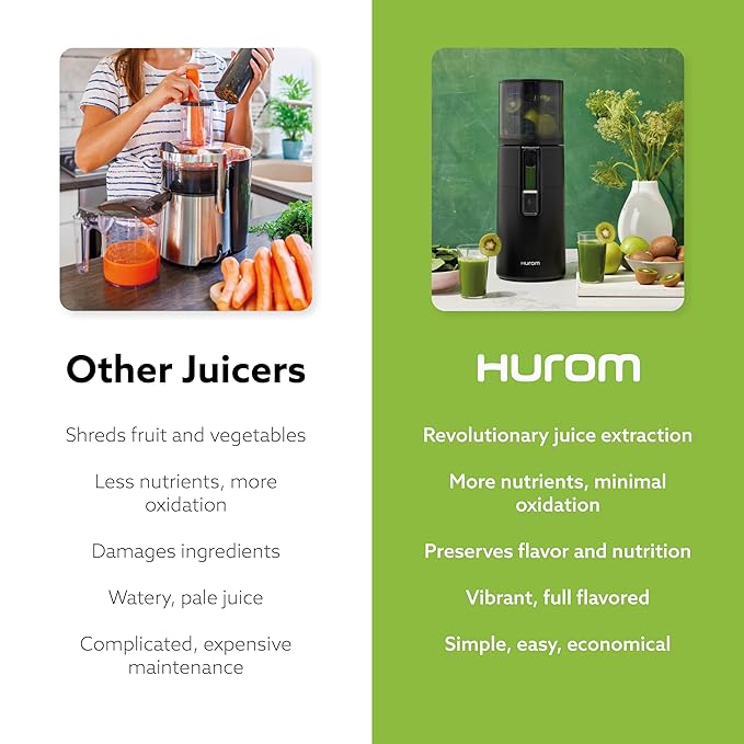 Upgrade your healthy lifestyle with the Hurom H70FT Easy Clean Slow Juicer in elegant Matte Black. This next-gen cold press masticating juicer is built for simplicity, health, and convenience—perfect for those who value nutrition and modern design. With hands-free juicing, a whole produce hopper, and scrub-free cleaning, the H400 is the ideal solution for effortless juicing at home.